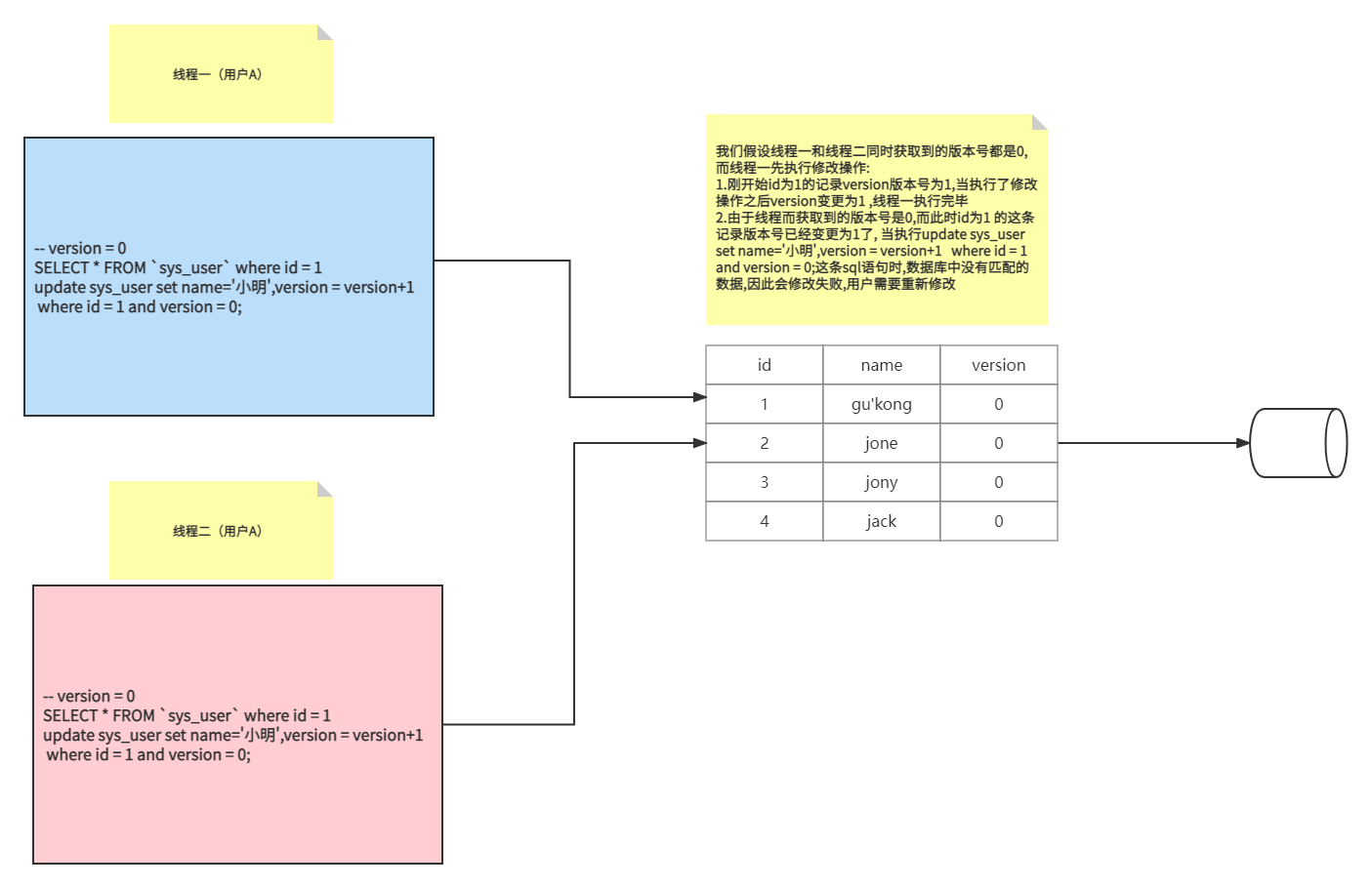 -- version = 0SELECT * FROM `sys_user` where id = 1 update sys_user set name="小明",version = version+1 and age = 20 where id = 1 and version = 0;-- version = 0 ,而此時version=1,更新失敗SELECT * FROM `sys_user` where id = 1 update sys_user set name = "小紅" version = version+1 and age = 25 where id = 1 and version = 0;