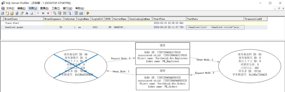 仔細觀察上面的這張圖可以清晰的看到,spid=66 持有了 Orders.PK_Orders 索引上哈希碼為 59ce0997f9b8 鍵值的 X 鎖,之后需要再次獲取 Employees.PK_Employees 索引上哈希碼為 8194443284a0 鍵值上的 S 鎖,很不巧的是,此時的 Employees.PK_Employees 索引上哈希碼為 8194443284a0 的鍵值已經被 spid=65 的會話附加了 X 鎖,這是一種典型的相互等待造成的死鎖。
