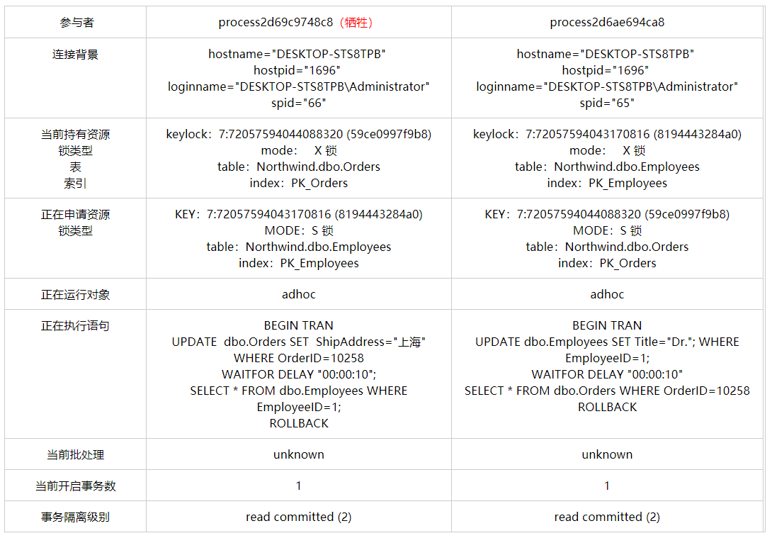 <deadlock-list> <deadlock victim="process2d69c9748c8"> <process-list> <process id="process2d69c9748c8" taskpriority="0" logused="324" waitresource="KEY: 7:72057594043170816 (8194443284a0)" waittime="1304" ownerId="70740" transactionname="user_transaction" lasttranstarted="2023-02-19T22:11:26.413" XDES="0x2d6a0200428" lockMode="S" schedulerid="5" kpid="13816" status="suspended" spid="66" sbid="0" ecid="0" priority="0" trancount="1" lastbatchstarted="2023-02-19T22:11:26.413" lastbatchcompleted="2023-02-19T22:11:26.410" lastattention="1900-01-01T00:00:00.410" clientapp="Microsoft SQL Server Management Studio - Query" hostname="DESKTOP-STS8TPB" hostpid="1696" loginname="DESKTOP-STS8TPB\Administrator" isolationlevel="read committed (2)" xactid="70740" currentdb="7" currentdbname="Northwind" lockTimeout="4294967295" clientoption1="671090784" clientoption2="390200"> <executionStack> <frame procname="adhoc" line="5" stmtstart="24" stmtend="128" sqlhandle="0x020000007383d935b349bc173c0f104de14945e9a526322b0000000000000000000000000000000000000000">unknown </frame> <frame procname="adhoc" line="5" stmtstart="204" stmtend="294" sqlhandle="0x020000002c3b203105961d63d10b17e54ed6ac081105f9450000000000000000000000000000000000000000">unknown </frame> </executionStack> <inputbuf>BEGIN TRANUPDATE dbo.Orders SET ShipAddress='上海' WHERE OrderID=10258WAITFOR DELAY '00:00:10'SELECT * FROM dbo.Employees WHERE EmployeeID=1;ROLLBACK </inputbuf> </process> <process id="process2d6ae694ca8" taskpriority="0" logused="368" waitresource="KEY: 7:72057594044088320 (59ce0997f9b8)" waittime="3468" ownerId="70716" transactionname="user_transaction" lasttranstarted="2023-02-19T22:11:24.247" XDES="0x2d6a7284428" lockMode="S" schedulerid="9" kpid="7124" status="suspended" spid="65" sbid="0" ecid="0" priority="0" trancount="1" lastbatchstarted="2023-02-19T22:11:24.247" lastbatchcompleted="2023-02-19T22:11:24.247" lastattention="1900-01-01T00:00:00.247" clientapp="Microsoft SQL Server Management Studio - Query" hostname="DESKTOP-STS8TPB" hostpid="1696" loginname="DESKTOP-STS8TPB\Administrator" isolationlevel="read committed (2)" xactid="70716" currentdb="7" currentdbname="Northwind" lockTimeout="4294967295" clientoption1="671090784" clientoption2="390200"> <executionStack> <frame procname="adhoc" line="5" stmtstart="26" stmtend="118" sqlhandle="0x02000000dd7720067e0519b8a368501716c04b4b50cfe6be0000000000000000000000000000000000000000">unknown </frame> <frame procname="adhoc" line="5" stmtstart="196" stmtend="282" sqlhandle="0x0200000093f01512208755a056f5f28930fbd3dedf58a2850000000000000000000000000000000000000000">unknown </frame> </executionStack> <inputbuf>BEGIN TRANUPDATE dbo.Employees SET Title='Dr.' WHERE EmployeeID=1;WAITFOR DELAY '00:00:10'SELECT * FROM dbo.Orders WHERE OrderID=10258ROLLBACK </inputbuf> </process> </process-list> <resource-list> <keylock hobtid="72057594043170816" dbid="7" objectname="Northwind.dbo.Employees" indexname="PK_Employees" id="lock2d69ccbbb80" mode="X" associatedObjectId="72057594043170816"> <owner-list> <owner id="process2d6ae694ca8" mode="X"/> </owner-list> <waiter-list> <waiter id="process2d69c9748c8" mode="S" requestType="wait"/> </waiter-list> </keylock> <keylock hobtid="72057594044088320" dbid="7" objectname="Northwind.dbo.Orders" indexname="PK_Orders" id="lock2d69ccbbf80" mode="X" associatedObjectId="72057594044088320"> <owner-list> <owner id="process2d69c9748c8" mode="X"/> </owner-list> <waiter-list> <waiter id="process2d6ae694ca8" mode="S" requestType="wait"/> </waiter-list> </keylock> </resource-list> </deadlock></deadlock-list>