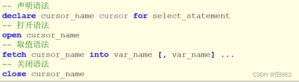 在語法中,變量聲明、游標(biāo)聲明、handler聲明是必須按照先后順序書寫的,否則創(chuàng)建存儲(chǔ)過程出錯(cuò)。