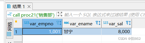 use test_procedure ;-- 需求:輸入一個(gè)部門名,查詢?cè)摬块T員工的編號(hào)、名字、薪資,將查詢的結(jié)果集添加游標(biāo)delimiter $$create procedure proc21(in in_name varchar(50))begin -- 定義局部變量 declare var_empno int; declare var_ename varchar(50); declare var_sal decimal(7,2); -- 聲明游標(biāo) declare my_cursor cursor for select empno ,ename ,sal from emp e,dept d where d.dname =in_name ; -- 打開游標(biāo) open my_cursor; -- 通過游標(biāo)獲得值 fetch my_cursor into var_empno,var_ename,var_sal; select var_empno,var_ename,var_sal; -- 關(guān)閉游標(biāo) close my_cursor;end $$delimiter ; call proc21("銷售部");運(yùn)行輸出的結(jié)果是