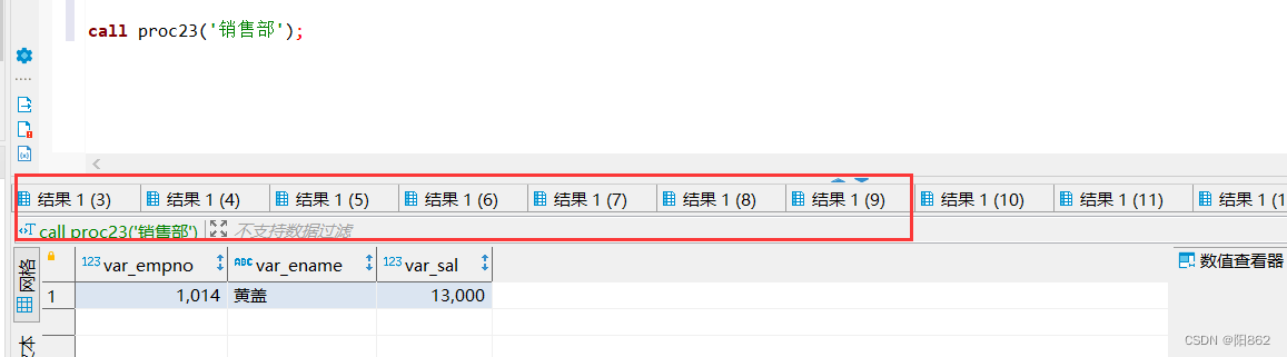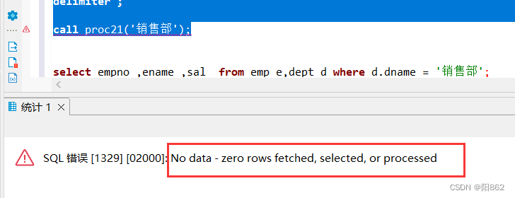 use test_procedure ;-- 需求:輸入一個(gè)部門名,查詢?cè)摬块T員工的編號(hào)、名字、薪資,將查詢的結(jié)果集添加游標(biāo)delimiter $$create procedure proc21(in in_name varchar(50))begin -- 定義局部變量 declare var_empno int; declare var_ename varchar(50); declare var_sal decimal(7,2); -- 聲明游標(biāo) declare my_cursor cursor for select empno ,ename ,sal from emp e,dept d where d.dname =in_name ; -- 打開游標(biāo) open my_cursor; -- 通過游標(biāo)獲得值 label:loop fetch my_cursor into var_empno,var_ename,var_sal; select var_empno,var_ename,var_sal; end loop label; -- 關(guān)閉游標(biāo) close my_cursor;end $$delimiter ; call proc21("銷售部");結(jié)果會(huì)報(bào)錯(cuò)