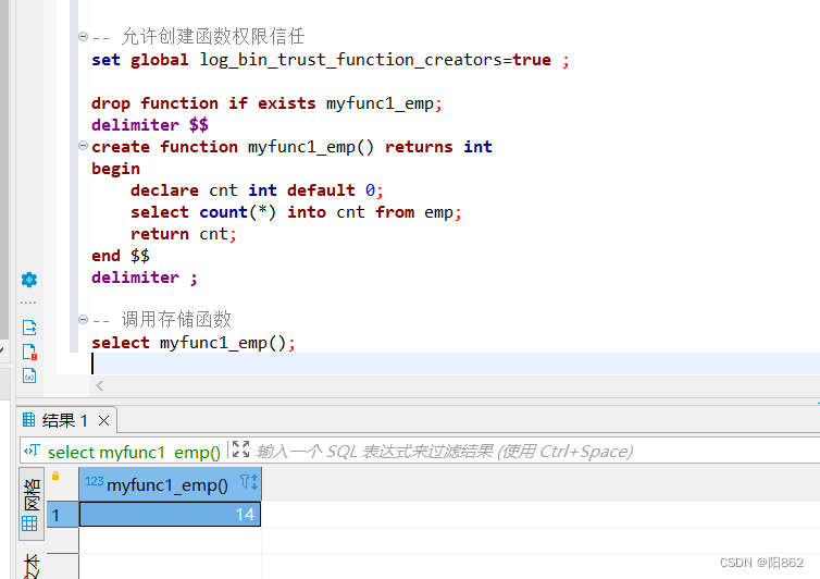 -- 允許創(chuàng)建函數(shù)權(quán)限信任set global log_bin_trust_function_creators=true ; drop function if exists myfunc1_emp;delimiter $$create function myfunc1_emp() returns intbegin declare cnt int default 0; select count(*) into cnt from emp; return cnt;end $$delimiter ; -- 調(diào)用存儲(chǔ)函數(shù)select myfunc1_emp();
