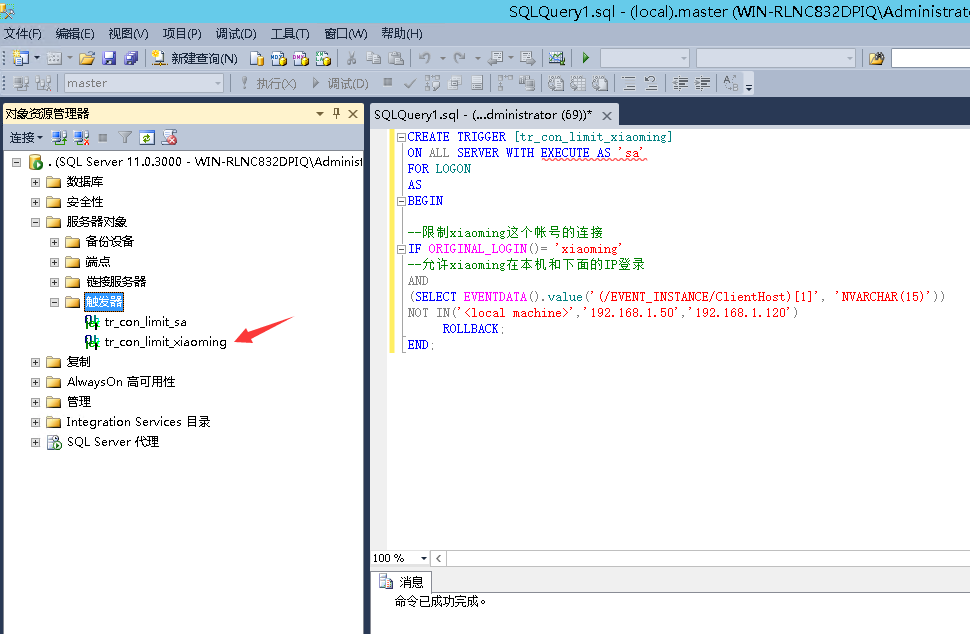 CREATE TRIGGER [tr_con_limit_xiaoming]ON ALL SERVER WITH EXECUTE AS "sa"FOR LOGONASBEGIN--限制xiaoming這個帳號的連接IF ORIGINAL_LOGIN()= "xiaoming"--允許xiaoming在本機和下面的IP登錄AND(SELECT EVENTDATA().value("(/EVENT_INSTANCE/ClientHost)[1]", "NVARCHAR(15)"))NOT IN("","192.168.1.2","192.168.1.3") ROLLBACK;END;執行之后就會創建一個叫做 tr_con_limit_xiaoming 的觸發器,如下圖