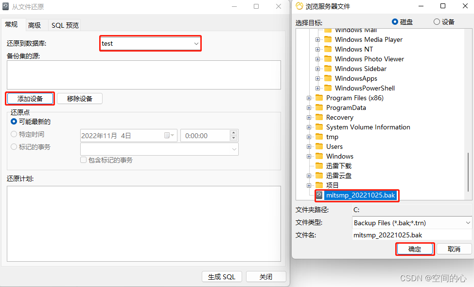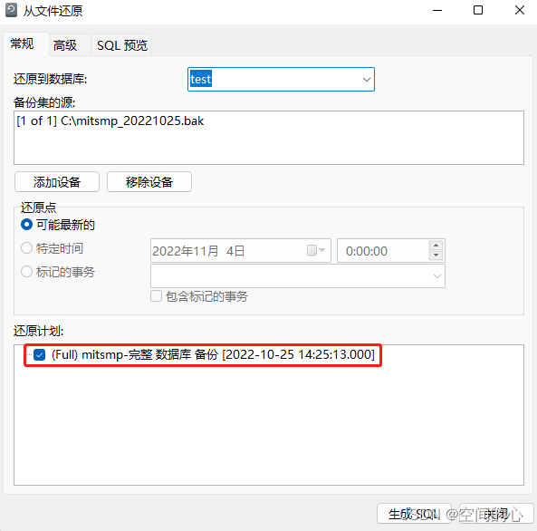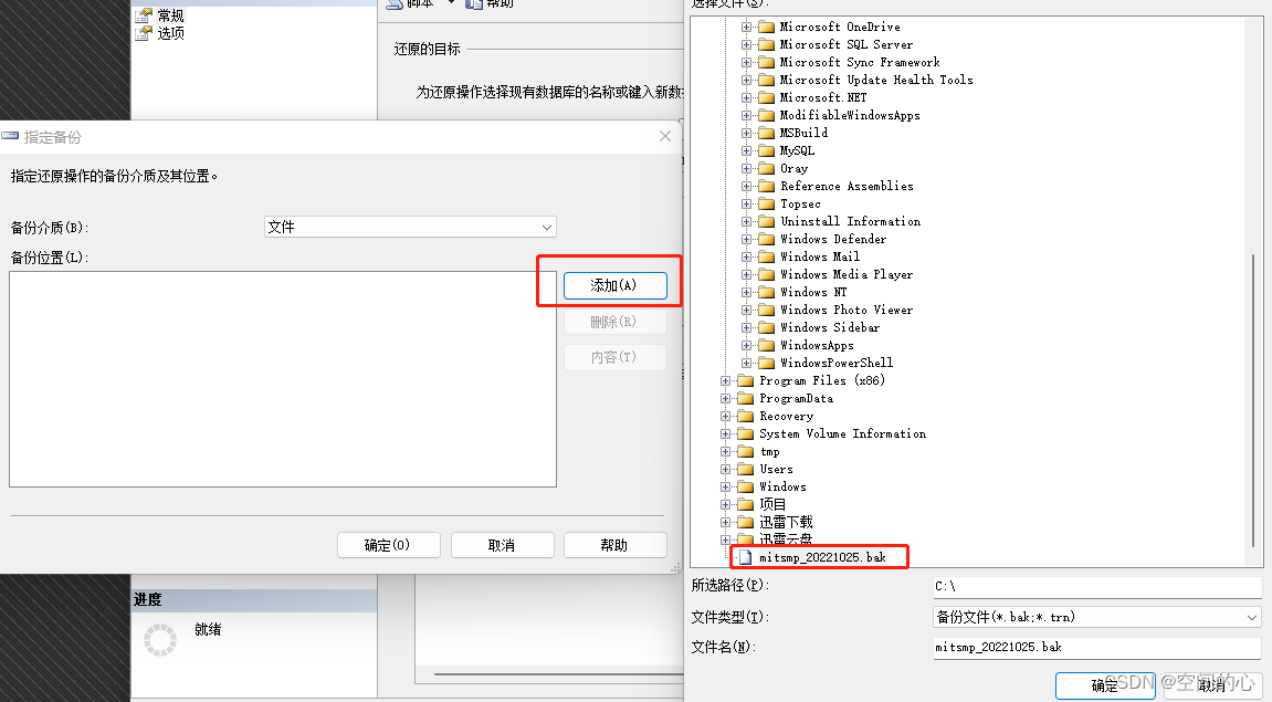 選擇需要還原到的數(shù)據(jù)庫(kù)→添加設(shè)備→選擇備份文件→確定