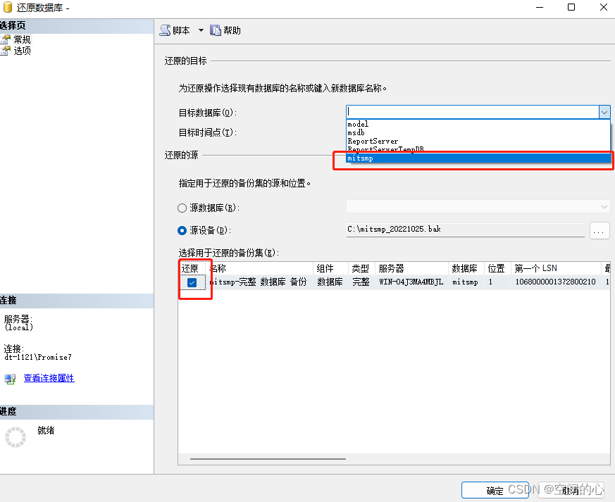 2005版本以上,在還原BAK備份文件時(shí)是不需要提前建好數(shù)據(jù)庫(kù)的。所以,先選源設(shè)備,再在下拉選項(xiàng)中選擇數(shù)據(jù)庫(kù)即可。