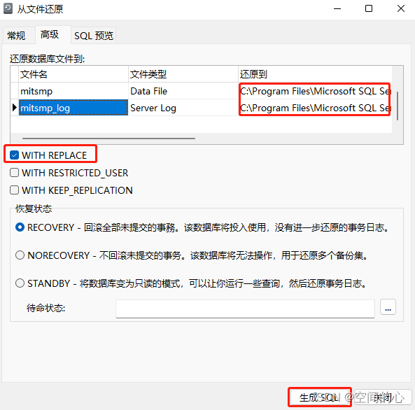 選擇高級(jí)→勾選WITH REPLACE→選擇數(shù)據(jù)文件和日志文件存放位置(這里不選擇會(huì)默認(rèn)放置在之前服務(wù)器/電腦的地址)→生成SQL