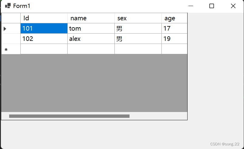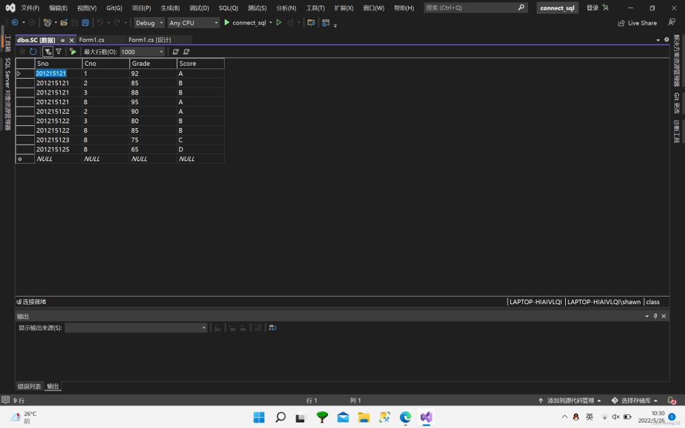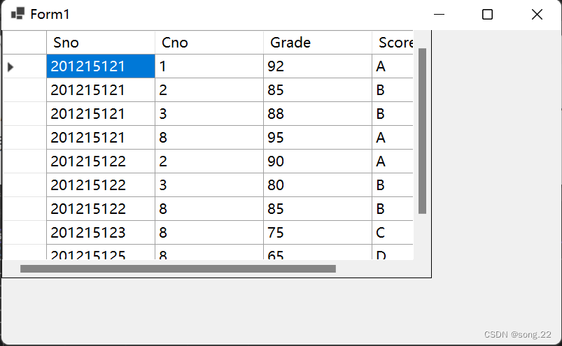 using System.Data;using System.Data.SqlClient;namespace connect_sql{ public partial class Form1 : Form {public Form1(){ InitializeComponent(); Table();} //數據寫入,公共的,所有有表格的地方都用的上 public void Table() { SqlConnection sqlcon = new SqlConnection(); sqlcon.ConnectionString = "Data Source=LAPTOP-HIAIVLQI;Initial Catalog=class;Integrated Security=True"; sqlcon.Open(); dataGridView1.Rows.Clear(); string sql = "select * from sc"; SqlCommand com = new SqlCommand(sql, sqlcon); SqlDataAdapter ada = new SqlDataAdapter(sql, sqlcon);//建立SQL語句與數據庫的連接 DataSet ds = new DataSet(); //實例化Datatable類 ada.Fill(ds); //添加SQL并且執(zhí)行 dataGridView1.DataSource = ds.Tables[0].DefaultView;//顯示數據 } }}運行程序,Form1窗體中已通過dataGridView顯示數據,且數據與源數據無誤。