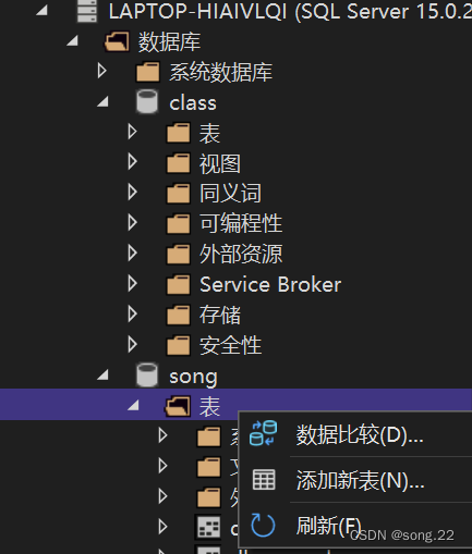 如圖,就可以看到vs已經連接到了自己的數據庫,class和song兩個數據庫 ??梢钥吹絚lass下面有五個表。