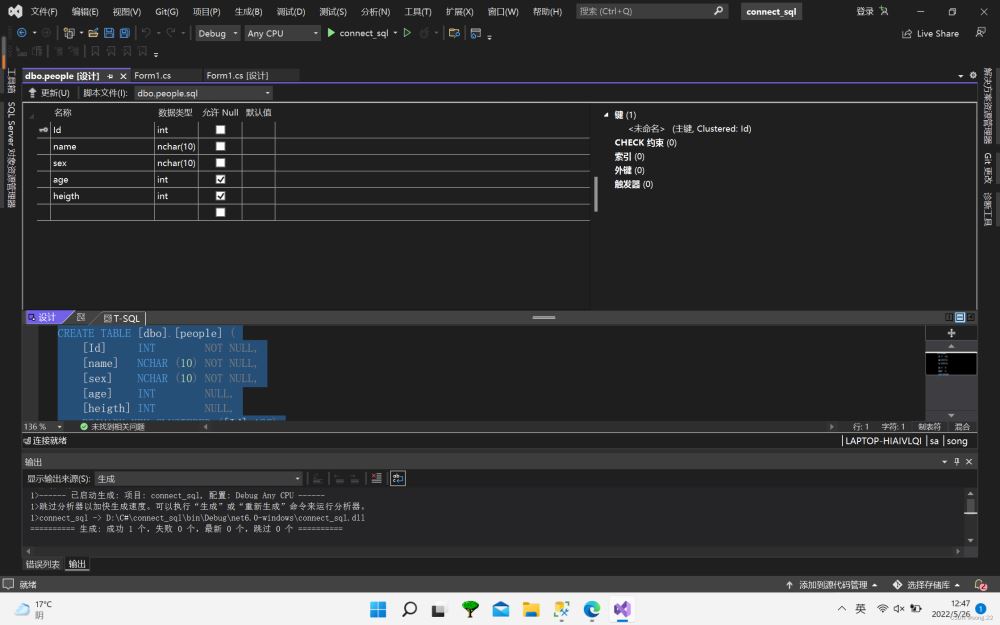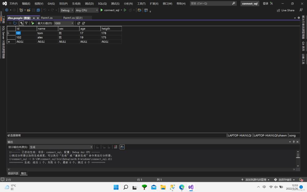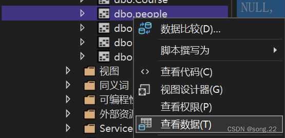 public void Table() { SqlConnection sqlcon = new SqlConnection(); sqlcon.ConnectionString = "Data Source=LAPTOP-HIAIVLQI;Initial Catalog=song;Integrated Security=True";//連接服務器 sqlcon.Open(); dataGridView1.Rows.Clear(); string sql = "select * from people";//SQL語句,可自己編寫需要的。 SqlCommand com = new SqlCommand(sql, sqlcon); SqlDataAdapter ada = new SqlDataAdapter(sql, sqlcon);//建立SQL語句與數據庫的連接 DataSet ds = new DataSet(); //實例化Datatable類 ada.Fill(ds); //添加SQL并且執(zhí)行 dataGridView1.DataSource = ds.Tables[0].DefaultView;//顯示數據 }那么以上就是VS連接SQL Server 數據庫一些基本操作。