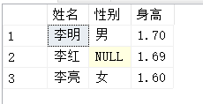 在以上示例語句中,沒有給身高提供值,依然插入成功了,只是在沒有提供值得地方顯示null