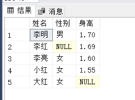 insert into 學(xué)生表01(姓名,性別,身高)values("李亮","女","1.60")執(zhí)行以上代碼后,查詢表可得結(jié)果:
