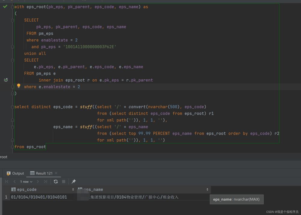 with eps_root(pk_eps, pk_parent, eps_code, eps_name) as( SELECT pk_eps, pk_parent, eps_code, eps_name FROM pm_eps where enablestate = 2 and pk_eps = "1001A11000000003P62E" union all SELECTe.pk_eps, e.pk_parent, e.eps_code, e.eps_name FROM pm_eps e inner join eps_root r on e.pk_eps = r.pk_parent where e.enablestate = 2)select distinct eps_code = stuff((select "/" + convert(nvarchar(500), eps_code) from (select distinct eps_code from eps_root) r1 for xml path("")), 1, 1, ""), --此次需要使用eps_code排序,不然中文的會錯亂順序 eps_name = stuff((select "/" + eps_name from (select top 99.99 PERCENT eps_name from eps_root order by eps_code) r2 for xml path("")), 1, 1, "")from eps_root執行sql,如下圖效果: