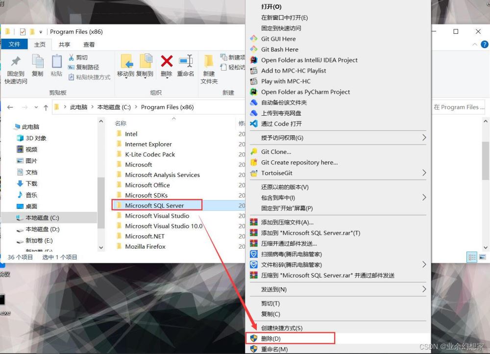 進入 C:\Program Files (x86) 文件夾下,找到 Microsoft SQL Server 文件夾,鼠標【右鍵】-【刪除】