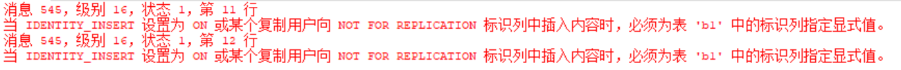 set identity_insert b1 off --關(guān)閉對(duì)標(biāo)識(shí)列的插入操作,標(biāo)識(shí)列不允許手動(dòng)插入顯示值