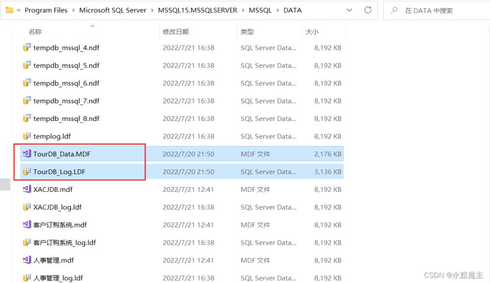 將復制好的數據庫文件粘貼到SQL Server的工作目錄下,我這里以路徑“C:\Program Files\Microsoft SQL Server\MSSQL15.MSSQLSERVER\MSSQL\DATA”為例。