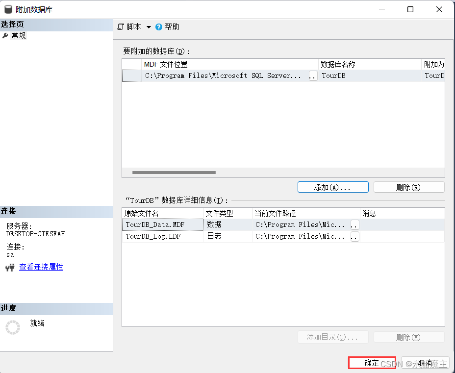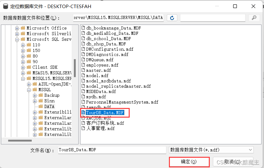 3.點擊添加,選擇剛才粘貼進數據庫工作目錄中的數據庫文件(這里以TourDB.MDF為例),點擊確定。