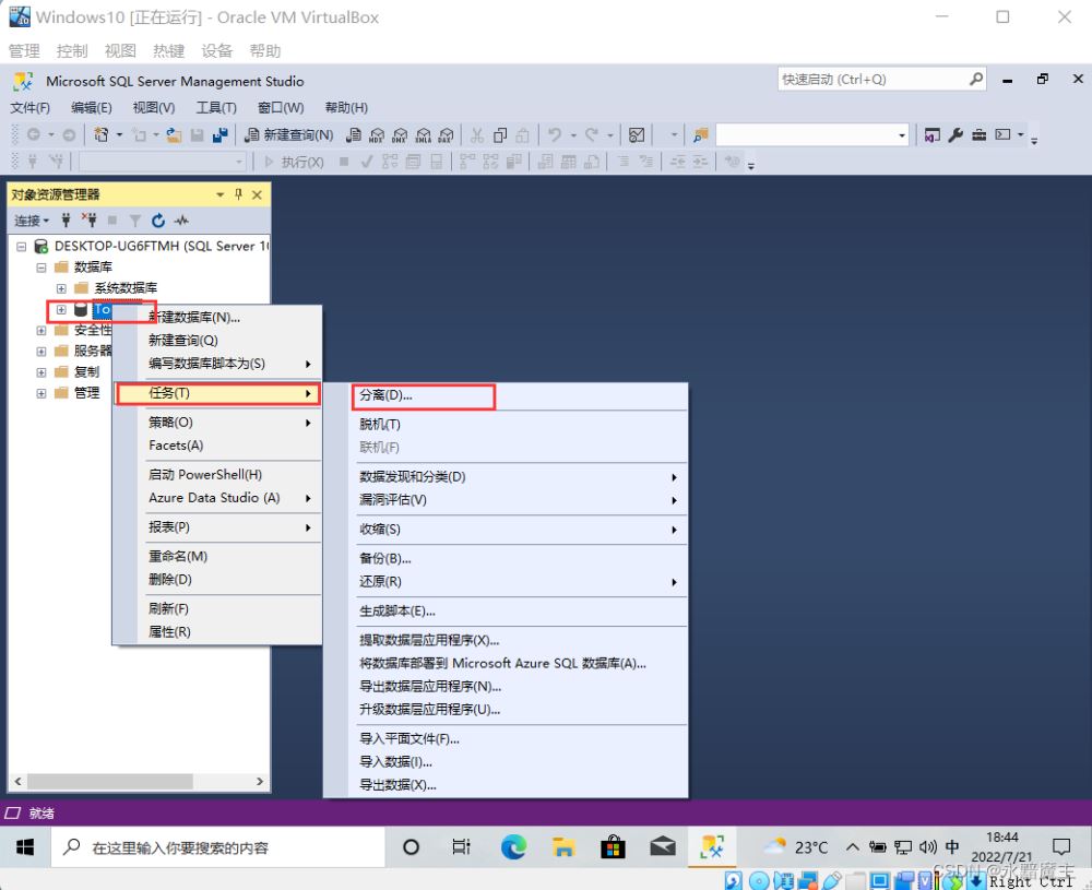 分離數據庫,點擊任務,選擇分離