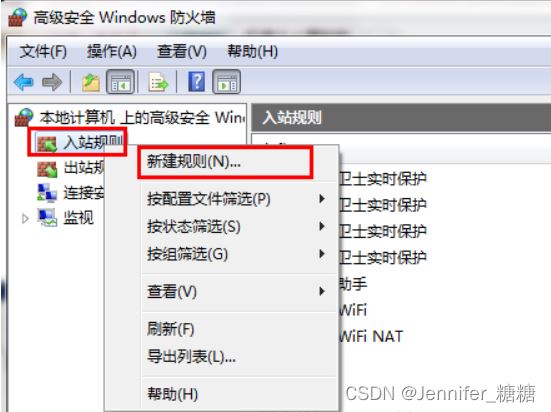 從上圖中我們可以看出,這臺SQL服務器上支持TCP/IP協議的是1433端口。下一步要做的是在防火墻的配置中允許1433端口支持TCP/IP協議即可。打開“控制面板”選擇“Windows防火墻”——“高級設置”。右擊“入站規則(Inboud Rules)”選項,選擇“新建規則(NewRule)”:
