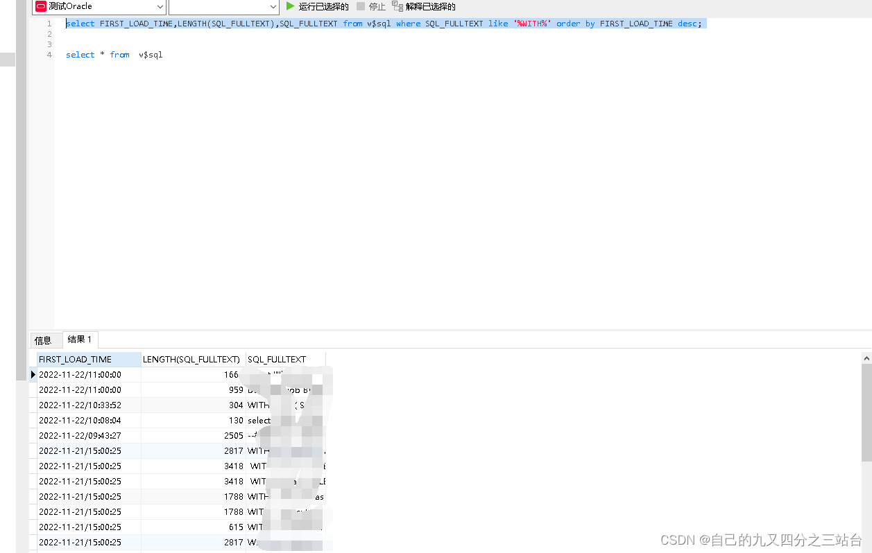 select FIRST_LOAD_TIME,LENGTH(SQL_FULLTEXT),SQL_FULLTEXT from v$sql where SQL_FULLTEXT like "%WITH%" order by FIRST_LOAD_TIME desc;select * from v$sql