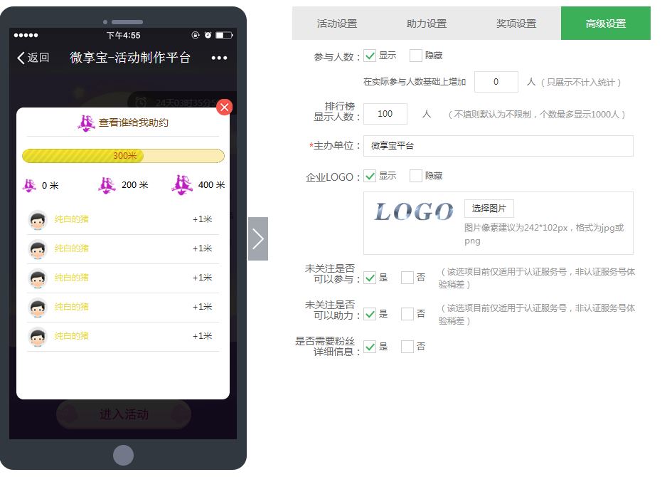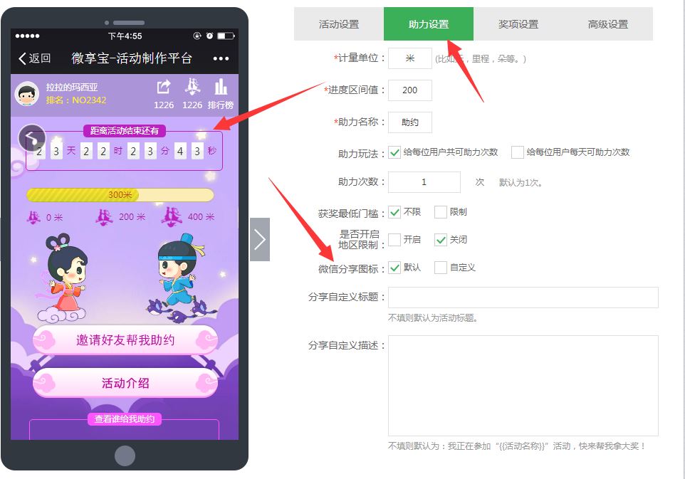 5.活動助力設置,可以選擇計量單位,例如里程,選擇不同的助力玩法和助力次數,下面的根據自己的需求勾選即可