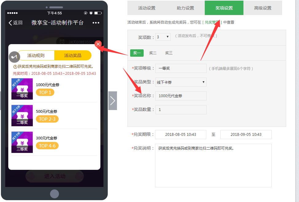 6.切換到獎項設置,選擇獎項類型,設置獎"品,然后切換到高級設置,注意里面勾選需要先關注和粉絲信息。