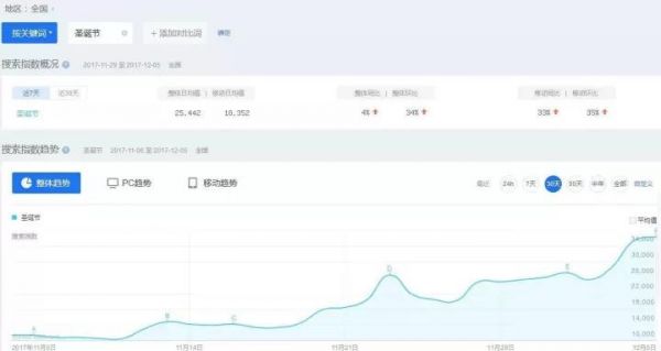 比如下圖,是我在百度指數搜索關鍵詞“圣誕節”的流量截圖,距12.25日的圣誕節還有20天左右,可是每天搜索量已經高達34000,試問競價員們,如此高的流量,你忍心錯過嗎!