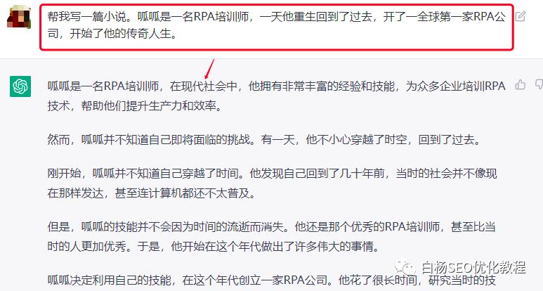 ChatGPT令人驚喜還有一個(gè),就是它能夠進(jìn)行文學(xué)創(chuàng)作。比如,給ChatGPT一個(gè)話題,它就可以寫(xiě)小說(shuō)框架。白楊流量匯會(huì)員阿愚呱呱群有個(gè)群友舉例“阿愚呱呱”為主題寫(xiě)一個(gè)小說(shuō)時(shí)。ChatGPT清晰地給出了故事背景、主人公、故事情節(jié)和結(jié)局哈哈哈。
