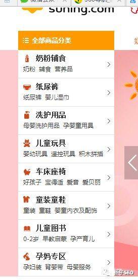 左側導航,一般是為了彌補頂部導航而存在的,因為網站的每個欄目下面都會有很多詳細的分類,這些分類不可能全部放置在頂部導航中,因此,需要采用左側導航來進行彌補。如下圖為蘇寧電商的左側導航: