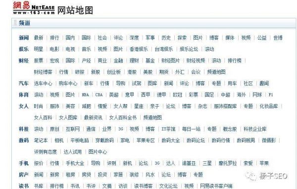 一般情況下,網站地圖在大型網站是經常用到的,(由于網站地圖在整個網站的優化中起到重要作用,因此,SEOer或網站建設者無論是什么網站都會規劃一個網站地圖,這以成為常態了)它是各種頁面導航的補充,當大型網站內容比較多時,需要采用網站地圖的形式,才能將整個龐大的網站結構完整地顯示在用戶面前。如下圖網易的部分網站地圖: