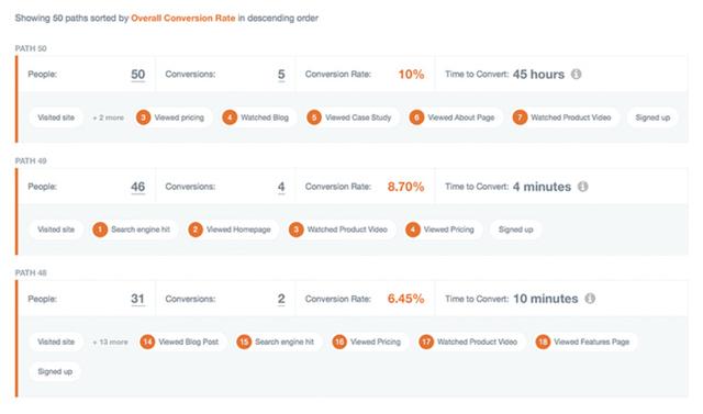 路徑報告可顯示訪問者的轉化路徑,用戶訪問頻道的方式(搜索引擎查詢,直接鍵入網址等),用戶采取的操作,以及每個路徑的轉化率以及轉化所花費的時間。這些數據讓開發人員更容易修正路徑,并可能為企業帶來直接收益。