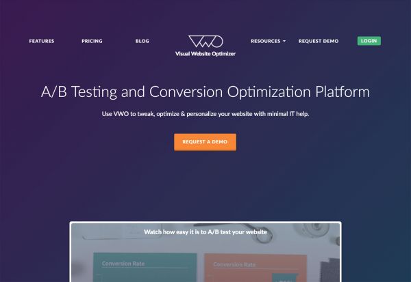 VWO用對比色“黃色”吸引用戶去體驗(yàn)產(chǎn)品demo。
