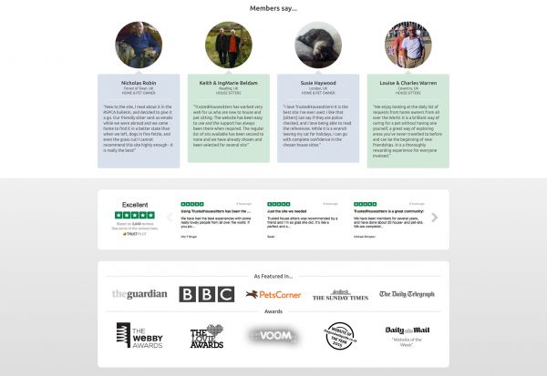 Trusted Housesitters展示了目前服務(wù)的知名企業(yè)標(biāo)識與獲得的獎(jiǎng)項(xiàng)。