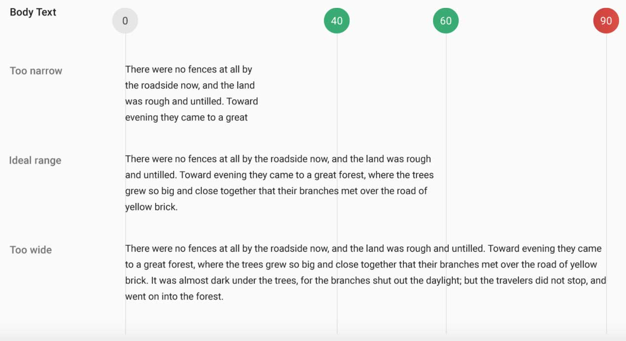 如果你想要一個良好的閱讀體驗,你應該每行約 60 個字符。在每行上擁有適當的字符數量是您的文本可讀性的關鍵。如果每行文字太短,視線必須反復折回來,打破讀者的節奏。如果一行文字太長,用戶的眼睛將很難專注于文本。