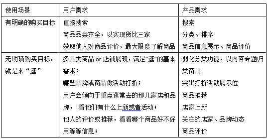 ① 大多數電商消費者的使用場景可分成兩大類,如下表: