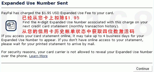 等待大約四個工作日,到你用國際信用卡開通的網上銀行(或致電到您的國際信用卡銀行)去獲取激活碼。此時登入網上銀行去查詢會發現扣了1.95美元,將來會返回到你的PayPal上。