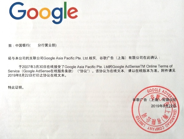今天抽空更新一下本篇文章。8月末收到google的證明文件,一共5頁,蓋的騎縫章,第一頁是中文的證明,有完整的章,后面4頁是英文的“Google AdSense Online Terms of Service”,即google adsense在線服務條款,一共16條,后來上網一查,就是https://www.google.com/adsense/tc/2018/UnitedStatesOfAmerica.html這個頁面的內容。