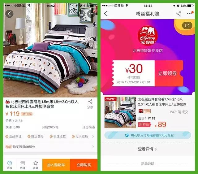 四件套:圖中這家天貓店的北極絨四件套,你自己去天貓店買需要119元,而可以領(lǐng)到30元內(nèi)部優(yōu)惠券,也就是說只需要89元就可以購買到這套加厚的漂亮的北極絨四件套!