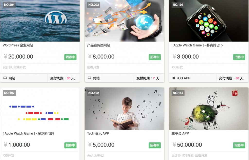 在項目類別上,Coding 碼市定位到了包括微信、APP、網站、HTML5、功能模塊等項目類型 ,并意欲把這些類型的開發標準化。不過,這樣可能會對傳統的小型外包公司產生沖突。