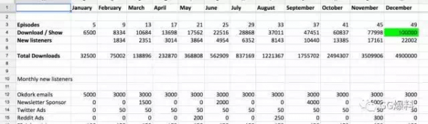 接下來就是把目標來逐步分解了,這時候需要一個時間軸來做切分。最近我通過執行這些策略來讓我的播客達到 100W 次的下載,我的目標是每期 10 萬次下載,我設定了一個 12 個月的目標來達成。