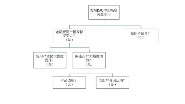 我們繼續以產品運營為例,比如我們突然發現某天產品的DAU增長幅度變大,按照上述的分析思路我們進行相應的梳理: