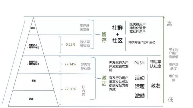 社區發帖量這一核心數據指標提升,是與整個社區的用戶量,用戶層級比例,用戶層級轉化,每個層級用戶行為,用戶粘性,社區內容質量,內容展示與推送情況等都存在一定的相關關系。所以,在社區的運營過程中就要不斷的促進各個影響維度與社區發帖量的正向關系。