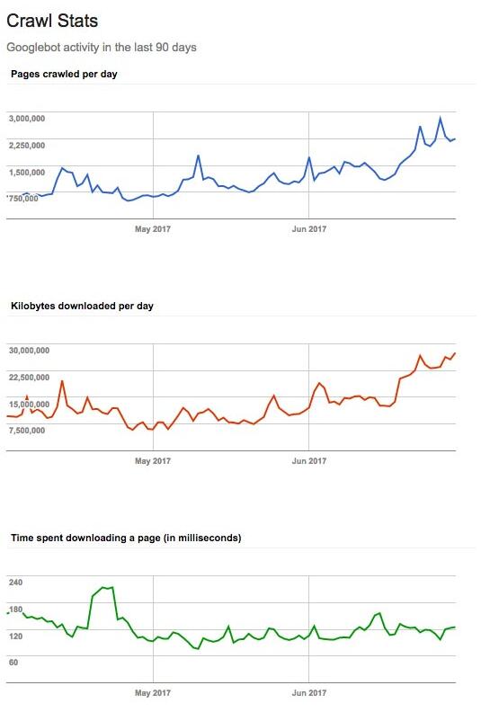 可以看到,抓取時間改善(減小頁面尺寸、提高服務器速度、優化數據庫),明顯導致抓取頻次上升,使更多頁面被抓取收錄,遍歷一遍網站更快速。