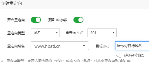 第四步:新增重定向,保留URL參數(shù)可設(shè)置關(guān)閉或打開( 301 需要保留),兩者區(qū)別如下: