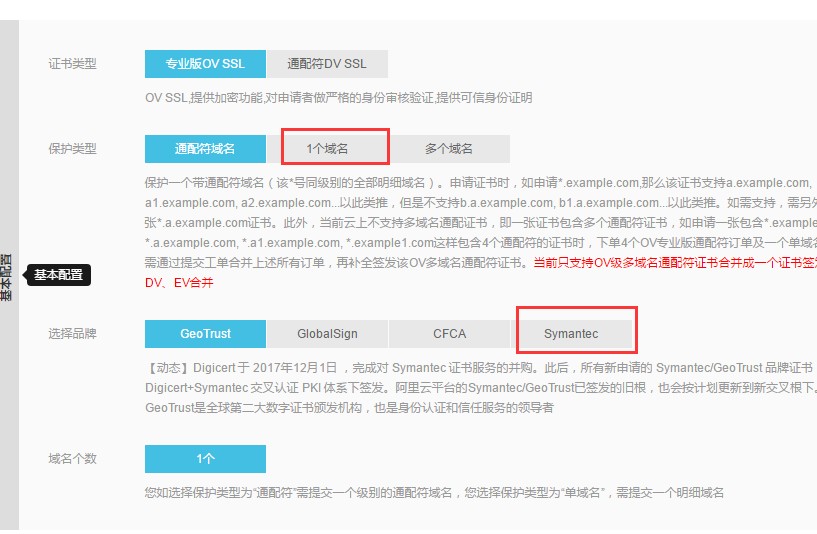 3.“保護類型”選擇“一個域名”,品牌選擇賽門鐵克。