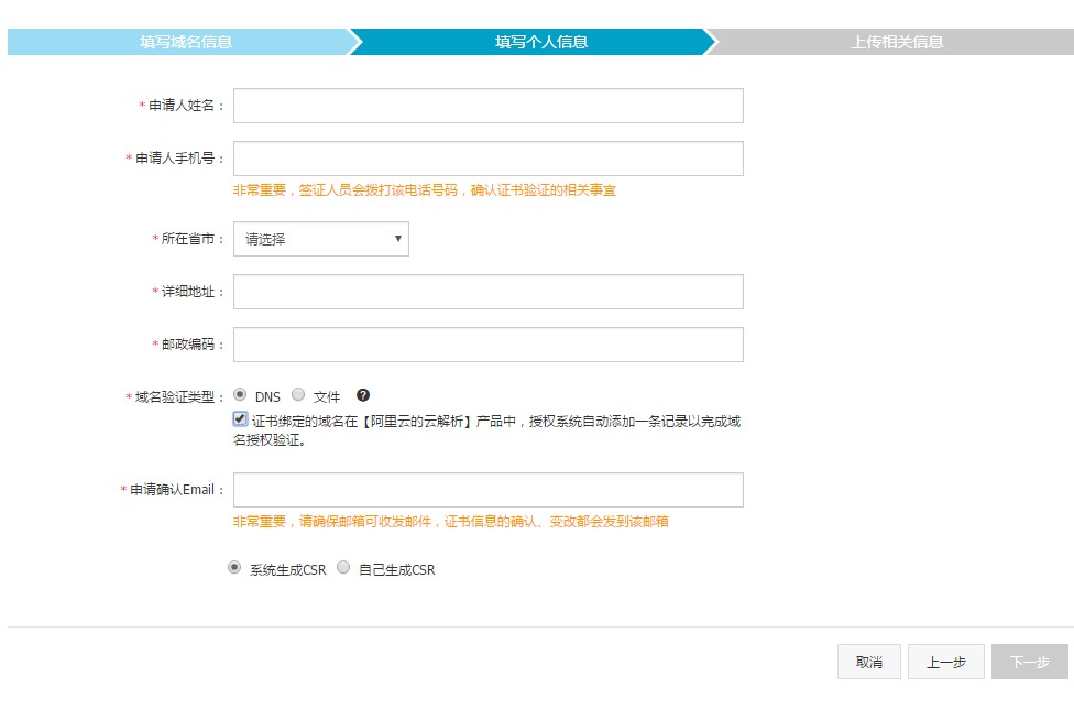 7.填寫個人信息,如果域名也在阿里云,域名驗證類型可以選擇DNS,并勾選。如果域名不在阿里云且服務器是linux的,那么選擇文件。