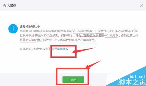 當我們修改好了,這時候就會出現下面的說明,名稱有一個15天的保護期和贖回期,而且我們還能撤銷修改!