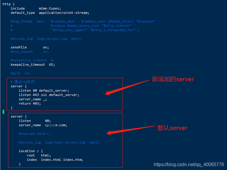 # 禁止ip訪問server { listen 80 default_server; listen 443 ssl default_server; server_name _; return 403;}注意是在所有的 server 前面添加一個新的 server,如圖所示
