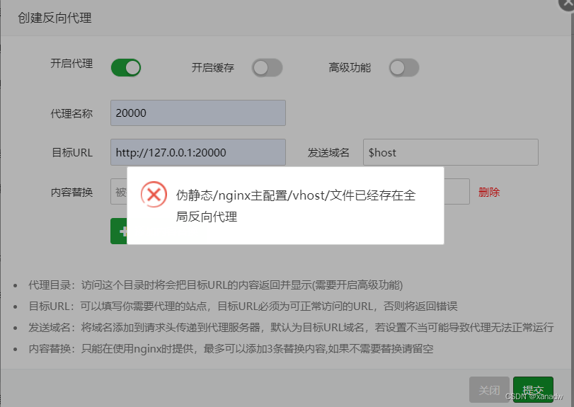 阿里云搭建的寶塔Linux面板,上面已經搭建過其它網站了,我現(xiàn)在給一個新增的網站增加一個反向代理端口,但是通過寶塔面板添加反向代理的時候,出現(xiàn)了下圖偽靜態(tài)的錯誤。