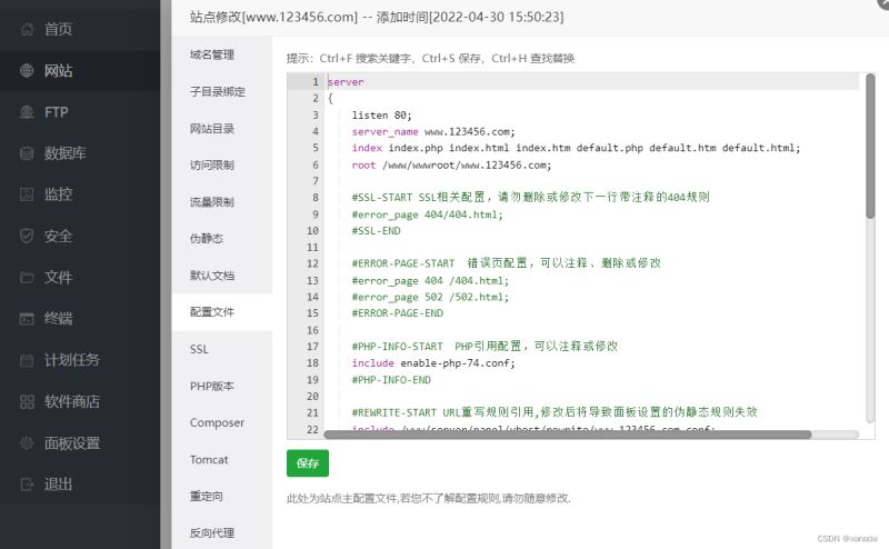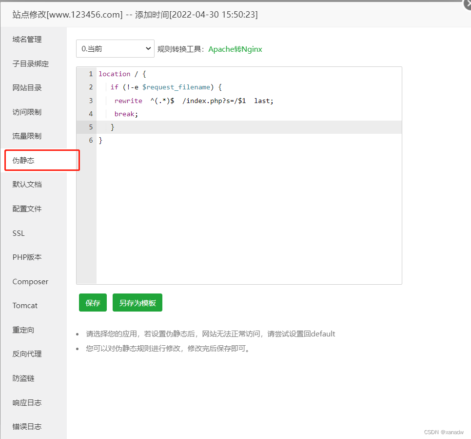server{ listen 80; server_name www.123456.com; index index.php index.html index.htm default.php default.htm default.html; root /www/wwwroot/www.123456.com; #SSL-START SSL相關配置,請勿刪除或修改下一行帶注釋的404規(guī)則 #error_page 404/404.html; #SSL-END #ERROR-PAGE-START 錯誤頁配置,可以注釋、刪除或修改 #error_page 404 /404.html; #error_page 502 /502.html; #ERROR-PAGE-END #PHP-INFO-START PHP引用配置,可以注釋或修改 include enable-php-74.conf; #PHP-INFO-END #REWRITE-START URL重寫規(guī)則引用,修改后將導致面板設置的偽靜態(tài)規(guī)則失效 include /www/server/panel/vhost/rewrite/www.123456.com.conf; #REWRITE-END #禁止訪問的文件或目錄 location ~ ^/(\.user.ini|\.htaccess|\.git|\.svn|\.project|LICENSE|README.md) {return 404; } #一鍵申請SSL證書驗證目錄相關設置 location ~ \.well-known{allow all; } location ~ .*\.(gif|jpg|jpeg|png|bmp|swf)$ {expires 30d;error_log /dev/null;access_log /dev/null; } location ~ .*\.(js|css)?$ {expires 12h;error_log /dev/null;access_log /dev/null; } access_log /www/wwwlogs/www.123456.com.log; error_log /www/wwwlogs/www.123456.com.error.log;}可以看到我這個配置頁面并沒有出現(xiàn)單獨的location /規(guī)則,都是加入了相關的后綴限制。但是可以看到上面還出現(xiàn)了一個 include /www/server/panel/vhost/rewrite/www.123456.com.conf 重寫的規(guī)則配置文件。